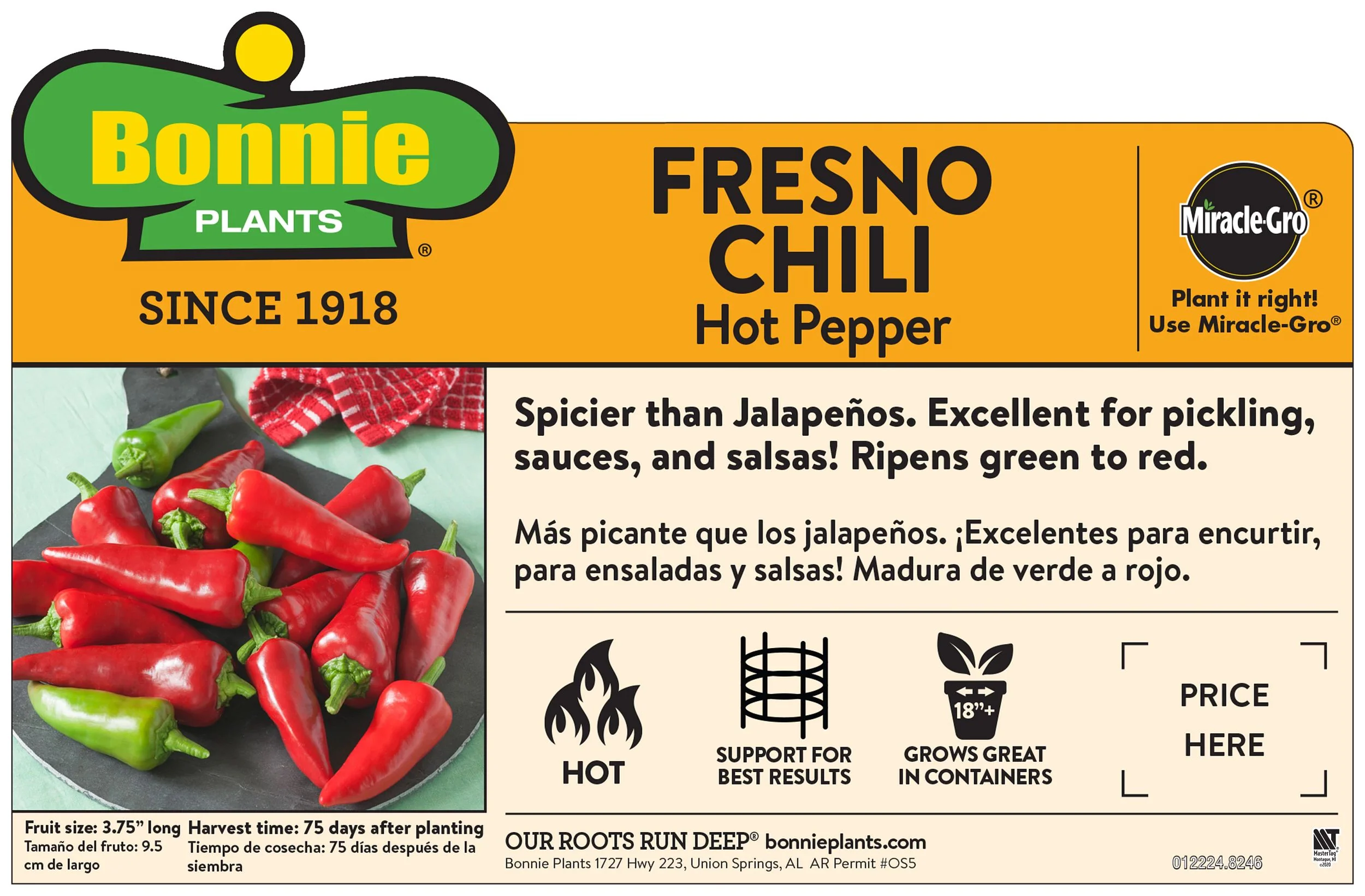 Heirloom. Fresno chili is a jalapeño-style chili, but hotter than most jalapeños. High yields of medium-sized fruit are borne on short, upright plants. The peppers ripen from green to red. Excellent for picking, canning, sauces, and salsas. Vigorous 24 to 30 inch tall plants have dense, dark green foliage and are resistant to tobacco mosaic virus. A good pickler, the fruit is also ready to eat at a mature green stage, even before it turns red.