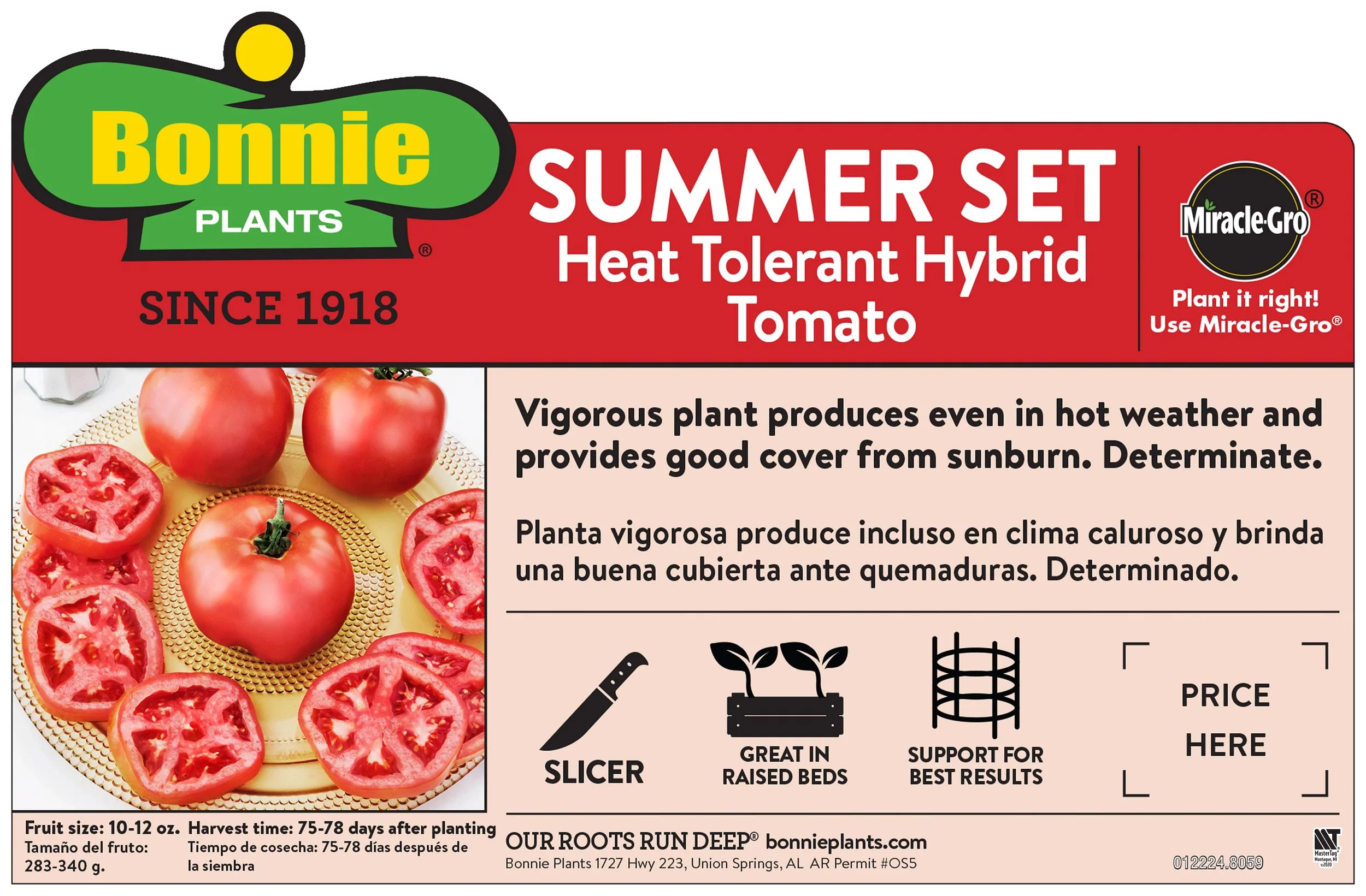 High temperatures don't usually affect fruit set on Summer Set tomato. This hybrid tomato has the genes to set fruit even during summer's intense heat. The large, globe-shaped tomatoes boast a firm texture and ripen relatively quickly. Count on Summer Set to add classic tomato flavor to salads and sandwiches. Fruit resists cracking even during the rainiest growing conditions. Since plants are only semi-determinate, plan to stake or cage them at the time of planting.